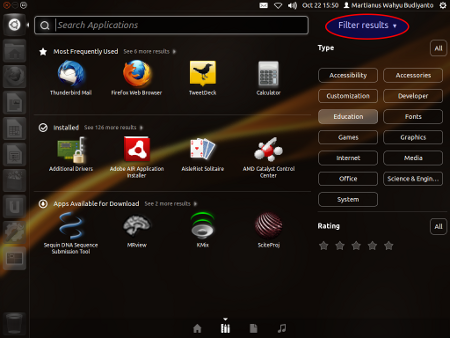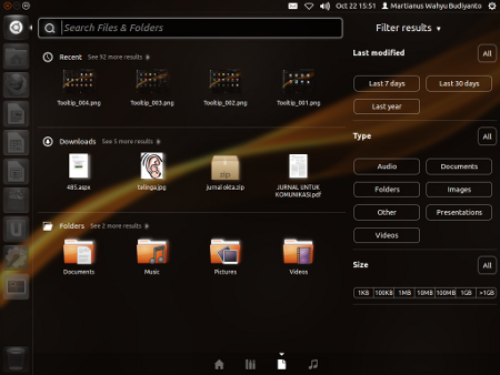 Tampilan memukau lain datang ke sistem Dash, yang sekarang dipecah menjadi bagian Home, Application, Search File, bahkan Search Music sendiri. Kalau Anda tekan tombol Super, di bagian bawah akan nampak pembagian ini. Juga ada fungsi Filter yang berfungsi seperti semacam kategori. Bisa dilihat di screenshot di bawah ini.