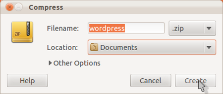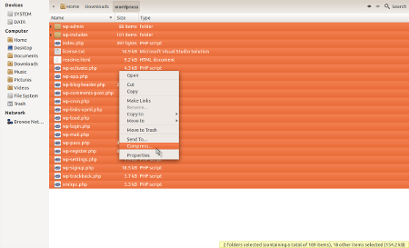 Langkah 4. Compress kembali seluruh installer WordPress. Kalau Anda menggunakan Ubuntu seperti saya, tinggal pilih semua file dan folder (Ctrl + A), lalu klik kanan, dan Compress. Pilih ekstensi zip saja.