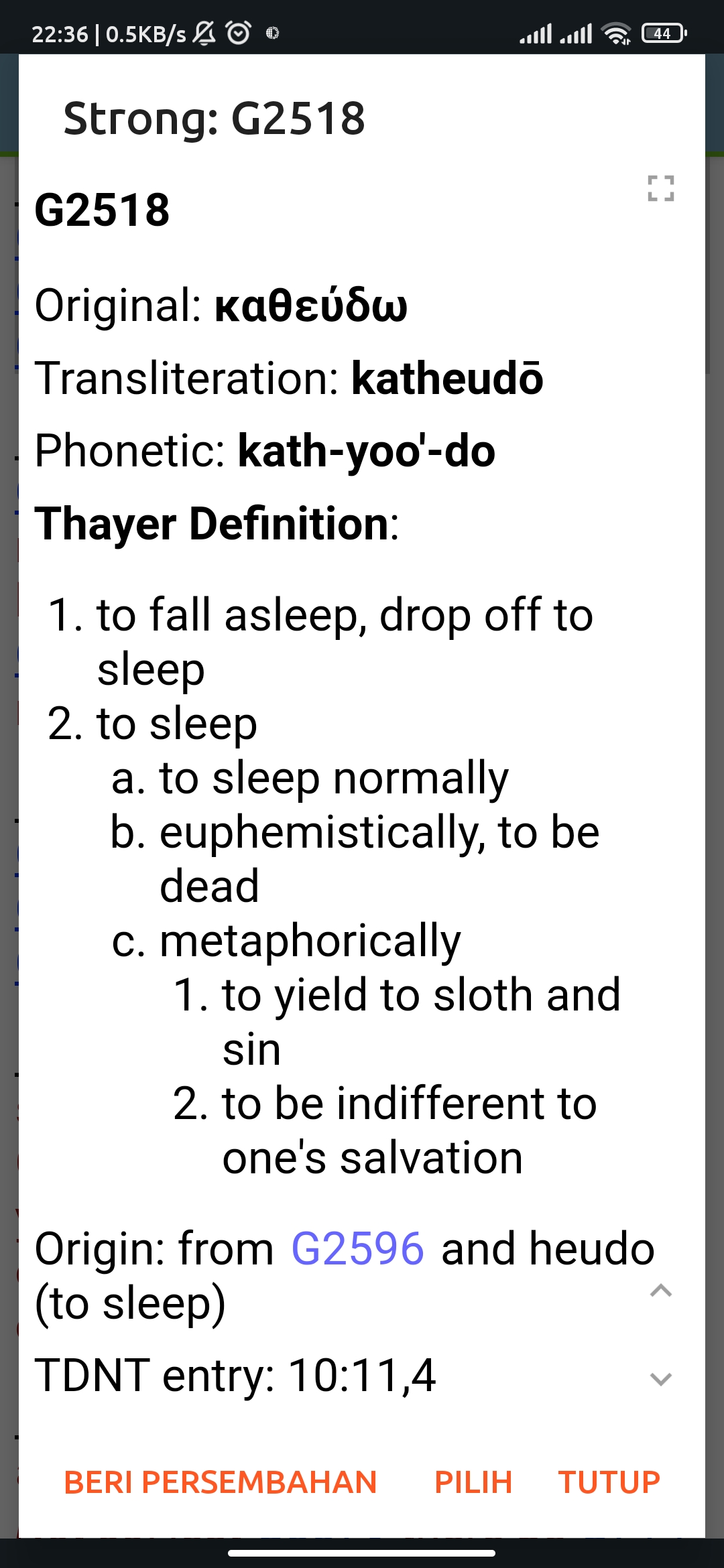 Keempat – ini yang saya jadikan judul khotbah ini – perhatikan bahwa kesepuluh gadis itu, semuanya tertidur. Digunakan kata “katheudo” yang rupanya punya makna metafor yang asik. Silakan buka kamus Strong, katheudo ini punya dua makna:
