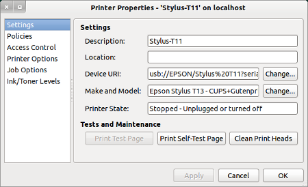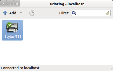 Saya menggunakan Epson Stylus T11, dan saya pikir akan ada sedikit masalah karena kernel baru yang digunakan oleh Ubuntu 11.10. Ternyata setelah printer saya hidupkan, dan langsung Ubuntu mendeteksi printer dan menginstal secara otomatis. Saya buka file, lalu saya coba cetak, dan … hurray sukses. Rupanya Ubuntu langsung mendeteksi Epson Stylus T11 dan menginstallnya dengan driver T13