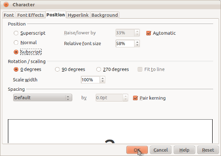 - Klik Format > Character … > Position