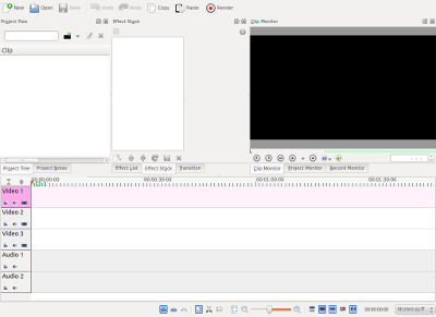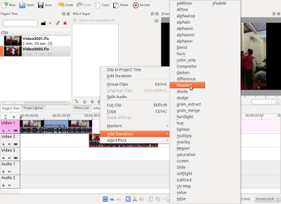 Nah, kali ini ada aplikasi “kdenlive” yang bisa diinstal langsung dari Ubuntu Software Center. Bagi yang terbiasa dengan editing video, maka penggunaan kdenlive sangat sederhana, mirip dengan Pitivi. Kelebihan dari kdenlive adalah fitur yang jauh lebih lengkap. Sudah disediakan efek transisi yang cukup banyak, efek video dan efek audio yang bisa dikustomisasi sendiri, penambahan title, dll. Bagi saya, kdenlive sudah sangat powerful sebagai video editor.