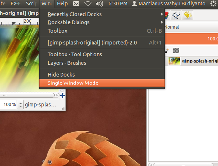 Yang juga berbeda pada Gimp 2.8 dibandingkan versi-versi sebelumnya adalah adanya fitur single window mode. Kalau di versi sebelumnya tampilan yang kita dapat biasanya seperti berikut ini.