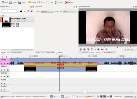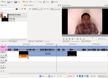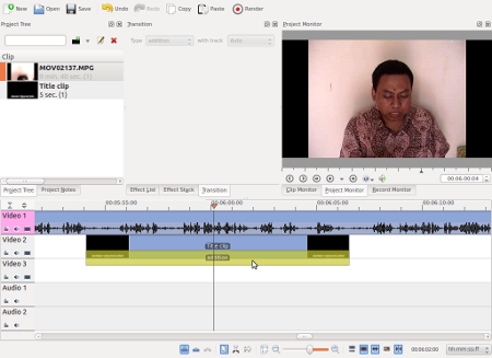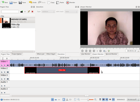 Ini bukan membuat Title Clip lho ya, kalau Title Clip kan harus ada di frame tersendiri. Jadi ini mau membuat semacam subtitle pada video begitu. Caranya cukup mudah sebenarnya. Pertama, buat dulu Title Clip dengan cara Project > Add Title Clip.