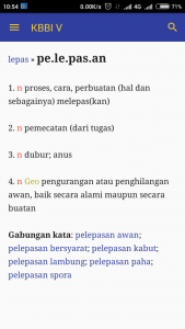 Dulu sering mendengar bahwa kalimat “Pelepasan Siswa-siswi …” dianggap tidak benar karena makna kata “pelepasan” itu adalah dubur atau anus. Benar, tetapi itu adalah salah satu polisem. Bahkan sempat diusulkan yang benar adalah “penglepasan”. Dengan aplikasi ini kita bisa tahu dengan mudah apa sebenarnya arti pelepasan, dan sebenarnya tidak ada kata penglepasan.